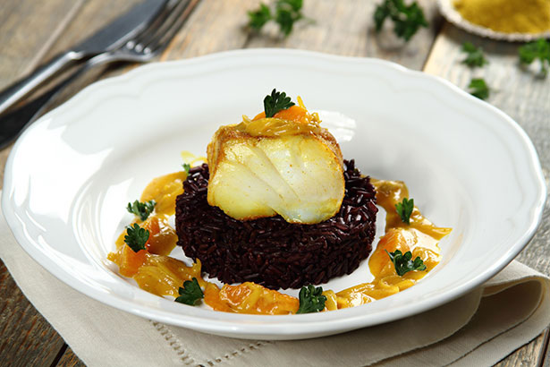 Dorsz z czarnym ryżem, mandarynkami i curry